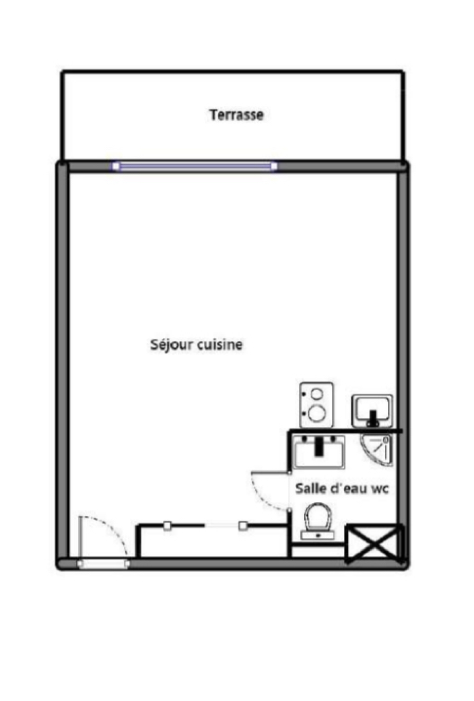 En rez-de-jardin, le bien se compose d’une pièce principale donnant sur une terrasse, d’une cuisine ouverte aménagée-équipée, d’une salle d’eau avec wc.