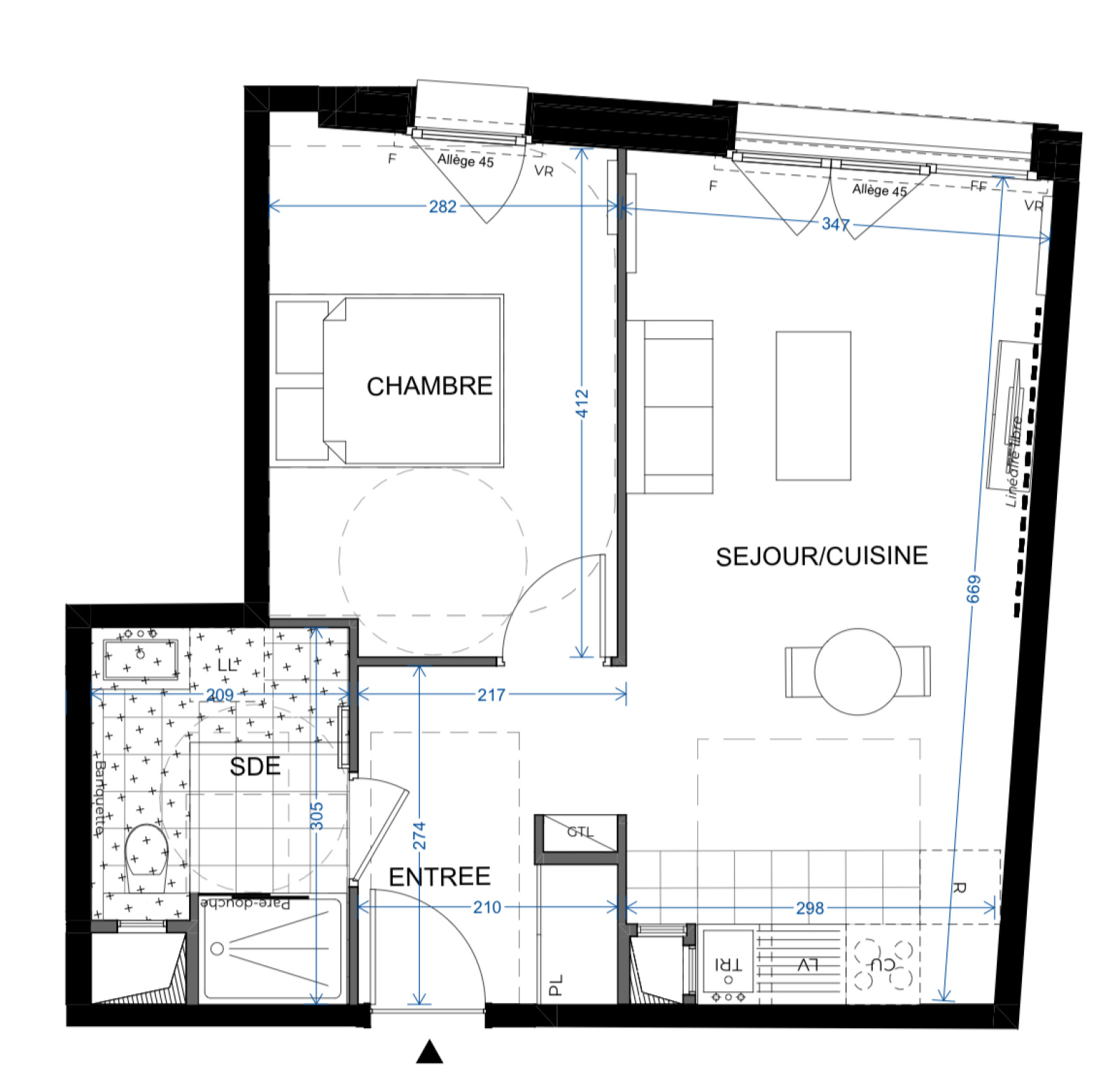 Un appartement de 2 pièces au 5è étage, offrant : une entrée, une pièce principale avec cuisine, une chambre, une salle d’eau avec un wc.
